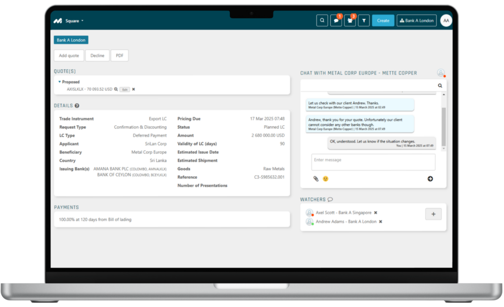 By centralizing trade finance workflows, front-office teams can share data, streamline approvals, and align on financing decisions.